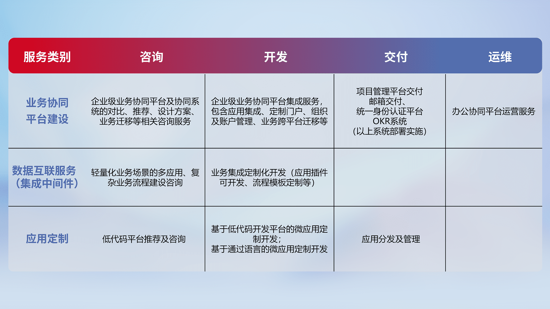 针对钉钉、、、企微、、、IDaas等平台级产品提供产品的规划、、、方案、、、交付、、、定制化开发等服务,,,,实现如统一协同办公、、、、智能客户服务、、混合会议管理、、、智能数据查询、、、等业务场景,,实现数字化转型。。